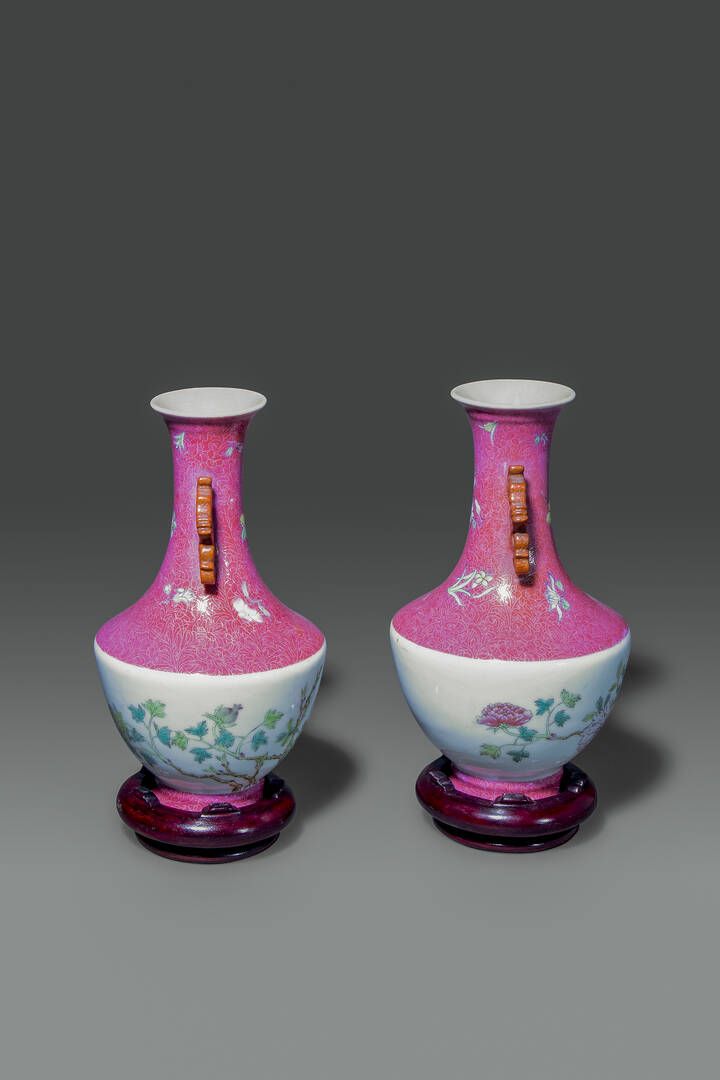 Coppia di vasi Famiglia Rosa con decori floreali su fondo rosa Cina Repubblica XX sec H cm 21x11
