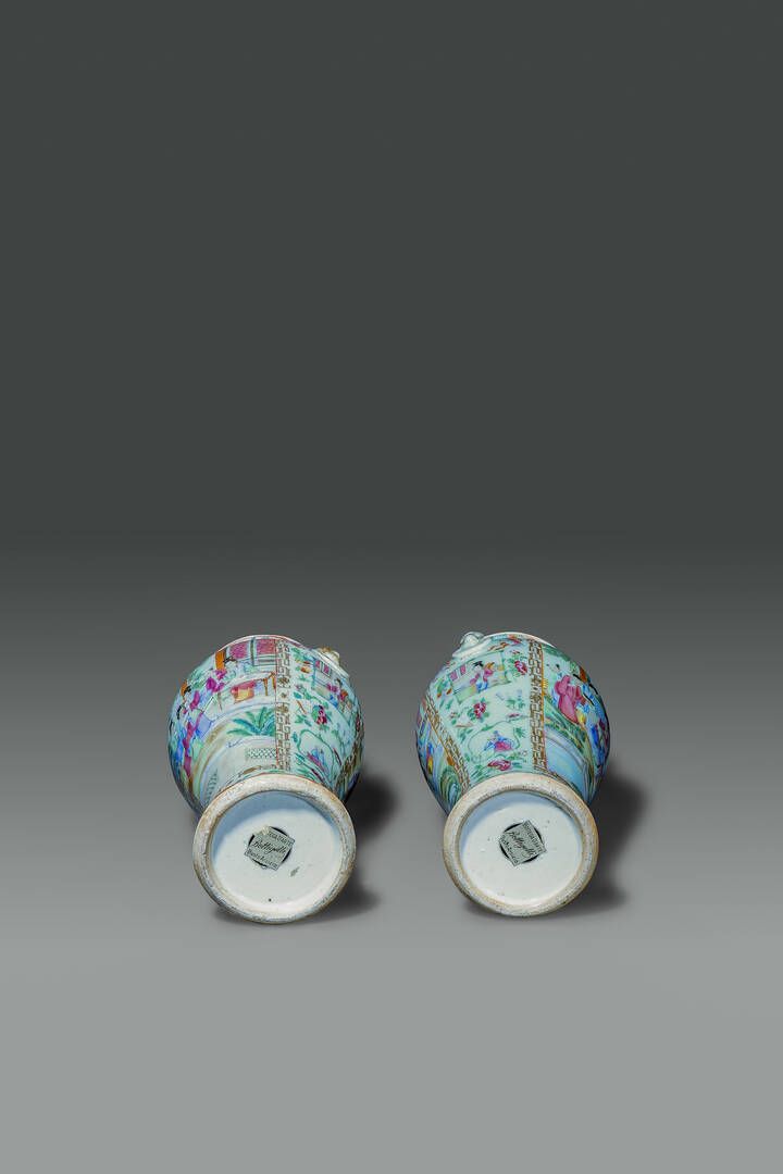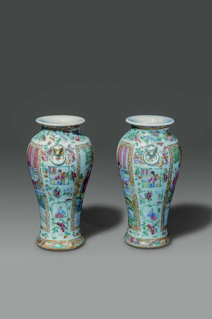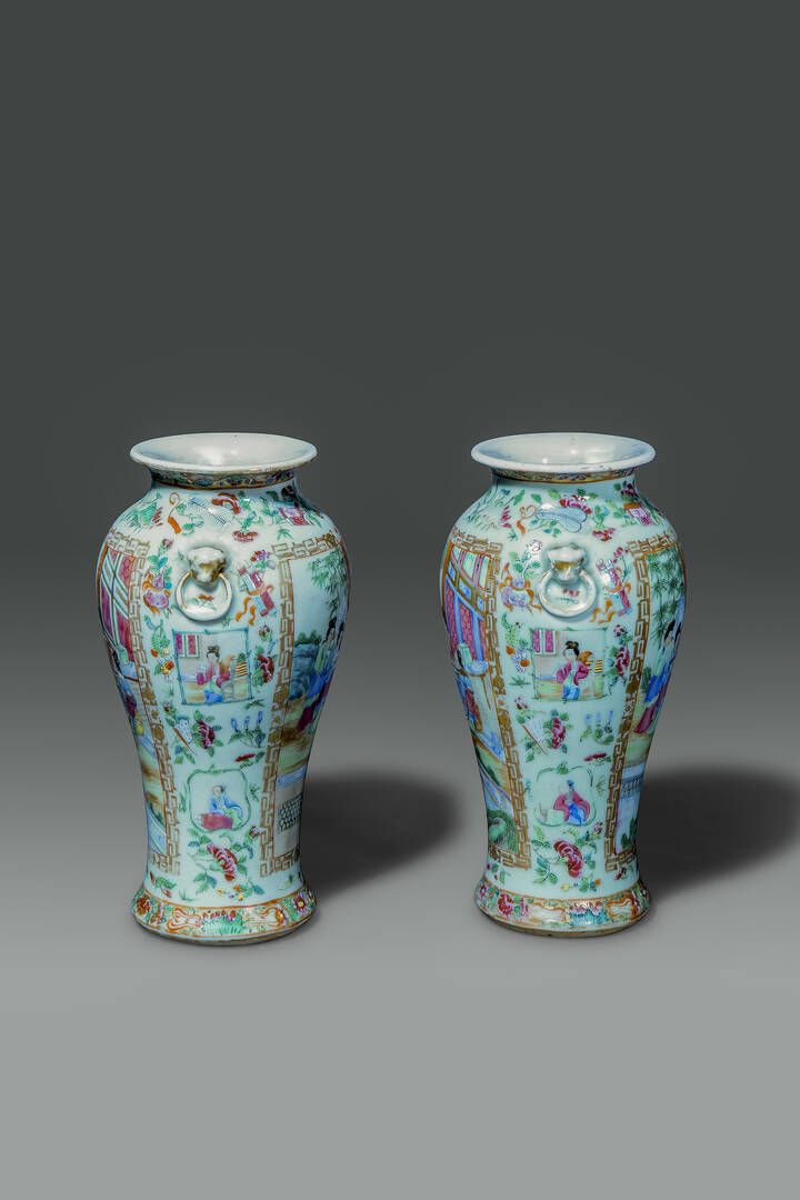 Coppia di vasi in porcellana Famiglia Rosa con scene di vita quotidiana entro riserve [..]