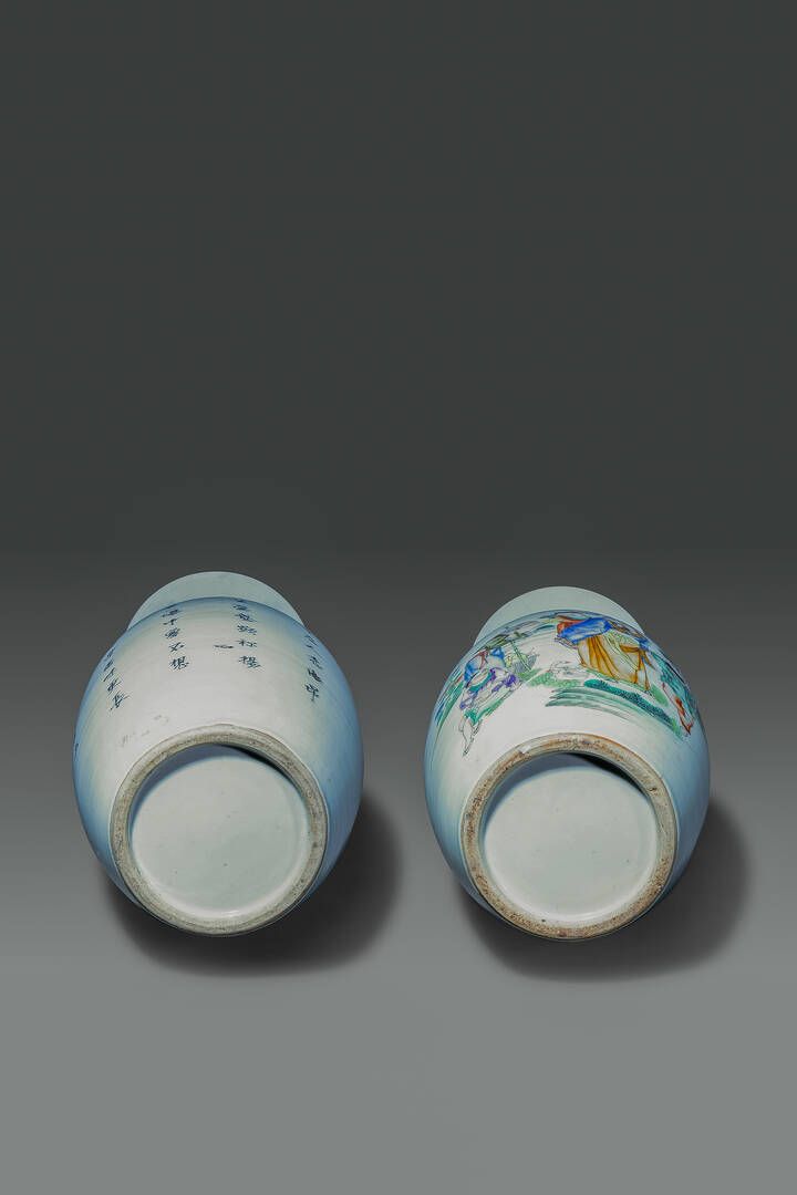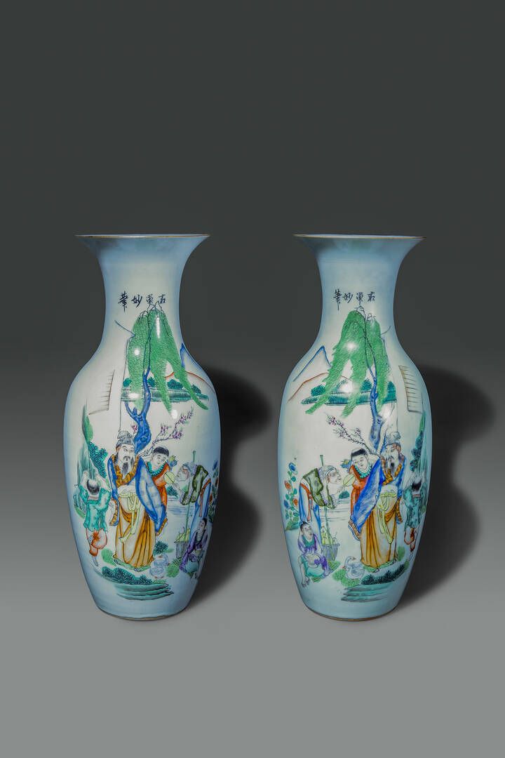 Coppia di vasi in porcellana Famiglia Rosa dipinti con personaggi e iscrizioni [..]
