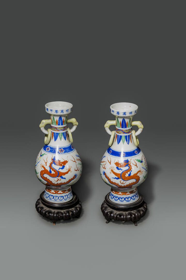 Coppia di vasi in porcellana Wucai con decoro di draghi e anse ad anello Cina Dinastia Qing XIX secolo Marchio apocrifo Wanli (1573-1620) H cm 22x11