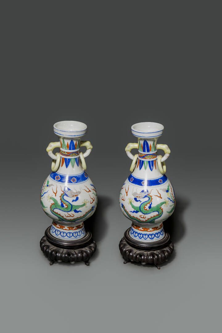 Coppia di vasi in porcellana Wucai con decoro di draghi e anse ad anello Cina [..]