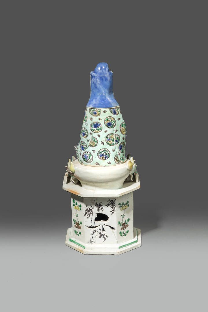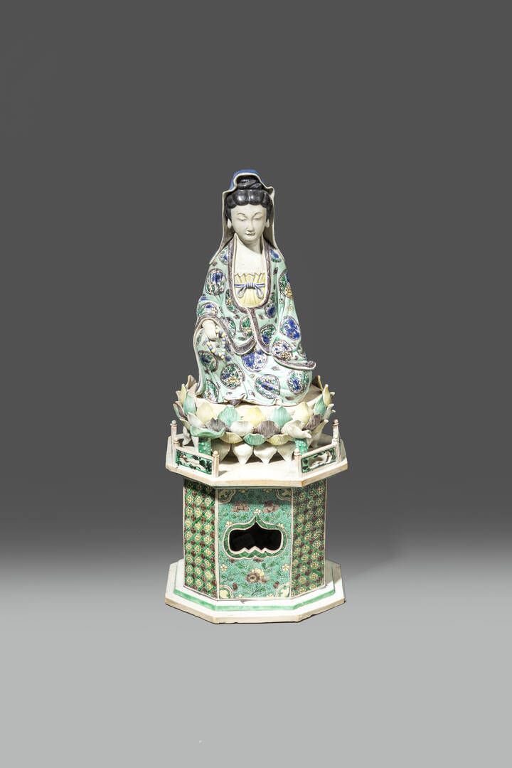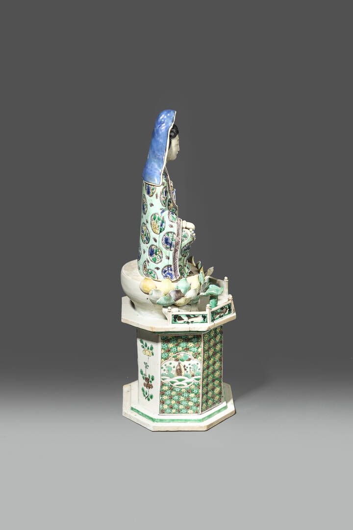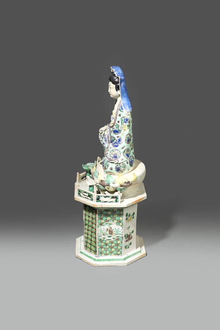 Figura di Guanyin seduta su fiore di loto in porcellana Famiglia Verde Cina dinastia Qing epoca Kangxi (1662-1722) H cm 43 Diam cm 17
