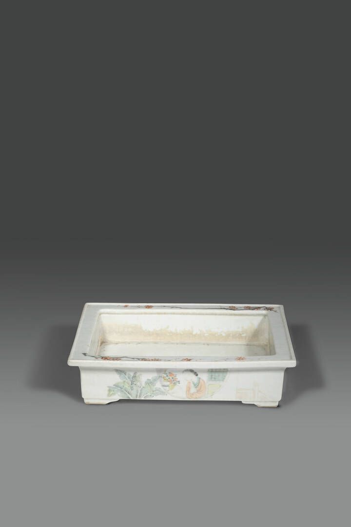 Giardiniera in porcellana Famiglia Rosa con decori policromi personaggio e iscrizioni Cina dinastia Qing XIX sec H cm 8x21 5x31