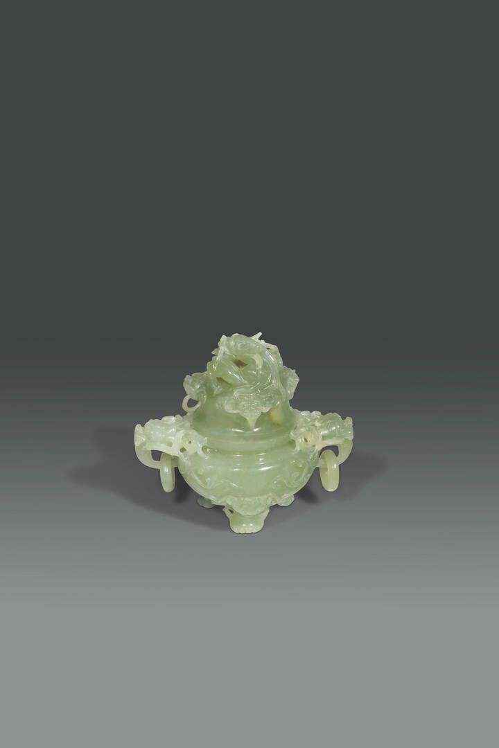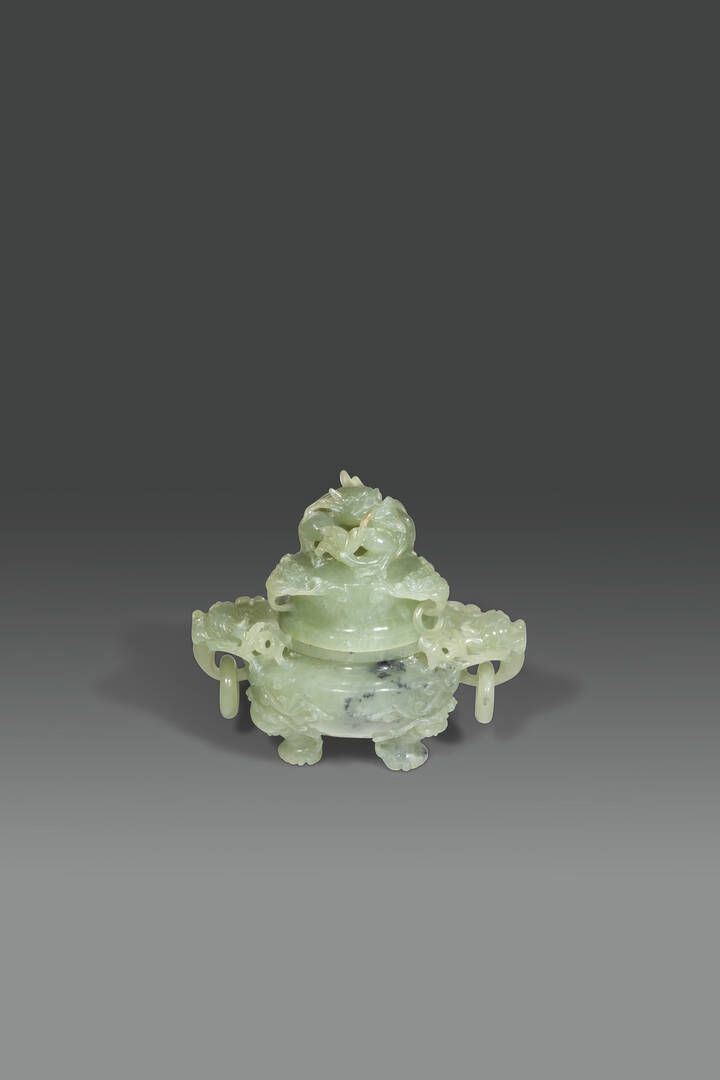 Incensiere tripode scolpito in giadeite verde con anse ad anello e presa a foggia [..]