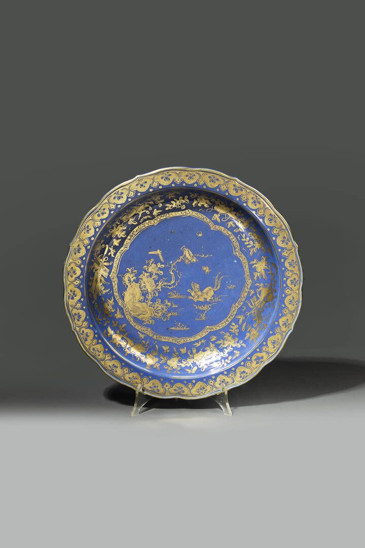 Piatto in porcellana monocroma blu con soggetto naturalistico centrale e decori floreali lumeggiati in color oro Cina dinastia Qing epoca Guangxu (1875-1908) Diam cm 39