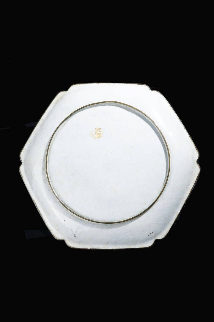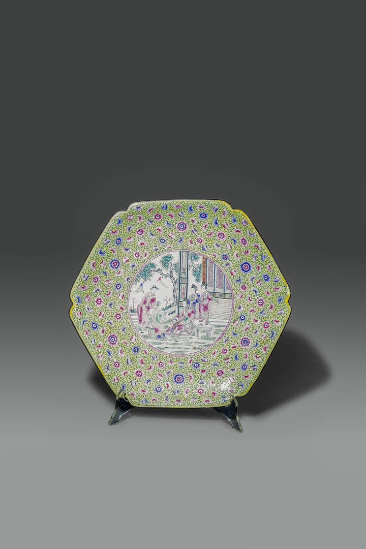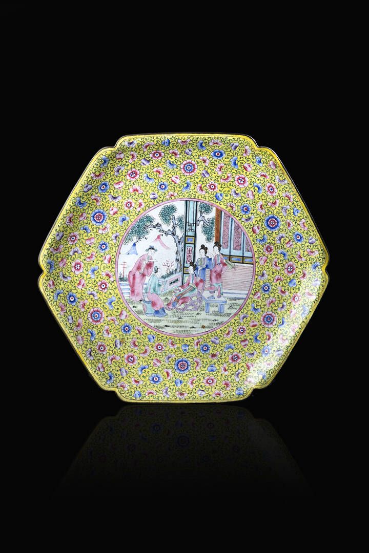Piatto in smalti a fondo giallo con scene di vita di corte Cina dinastia Qing [..]