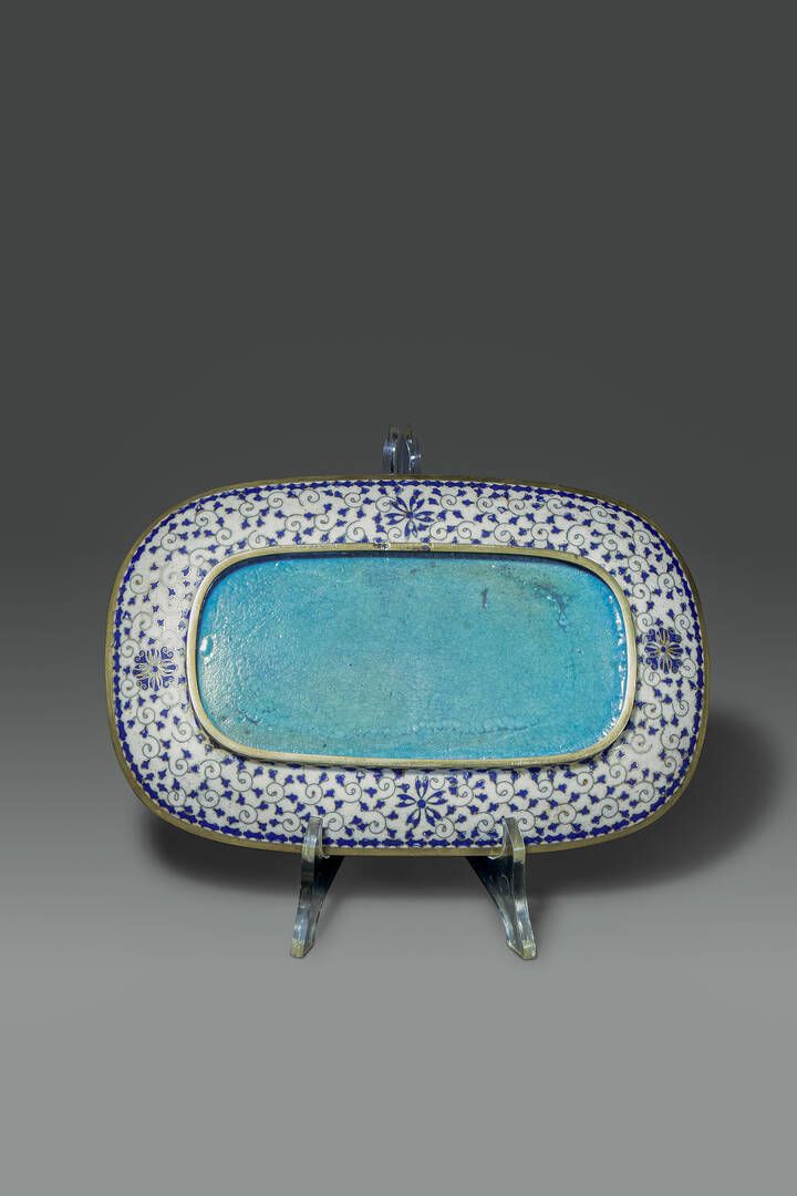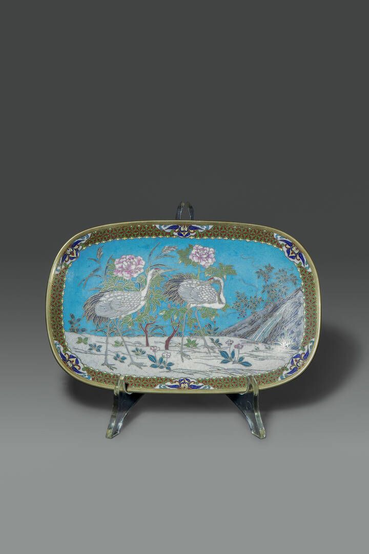 Piccolo vassoio in cloisonne finemente decorato con con gru e fiori di peonia Cina [..]