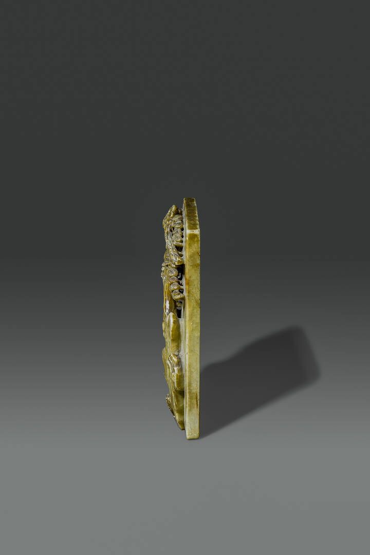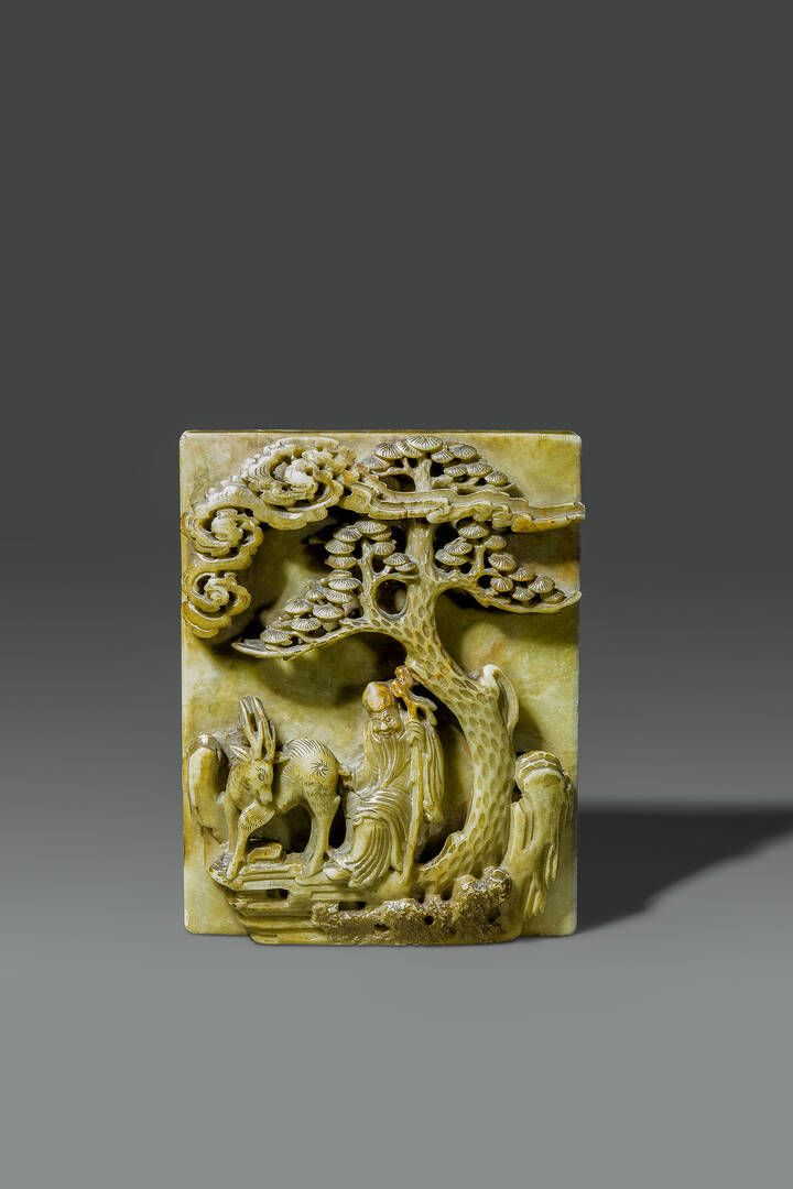 Placca scolpita in saponaria con figura di Shoulao entro paesaggio Cina dinastia [..]