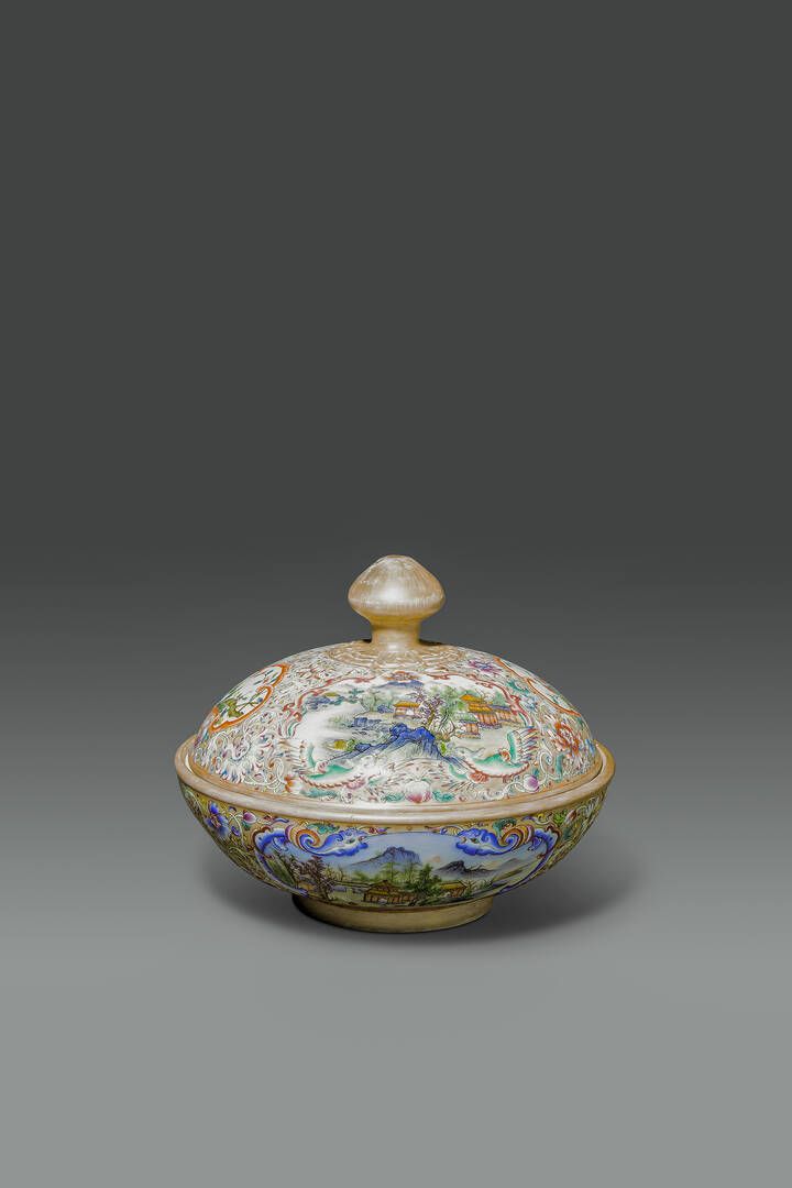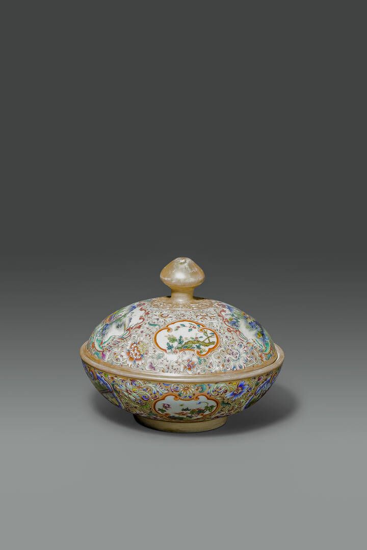 Portavivande in porcellana Famiglia Rosa decorata con fiori e paesaggi entro riserve Cina XX sec H cm 18 Diam cm 21 5
