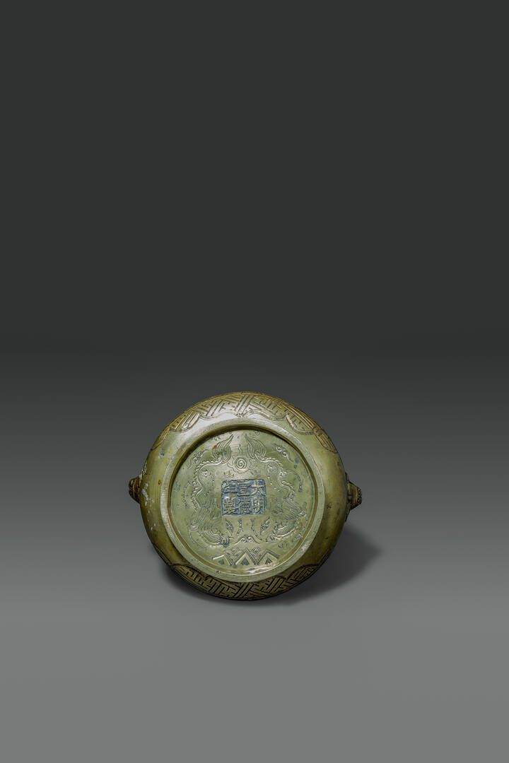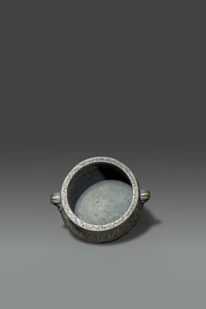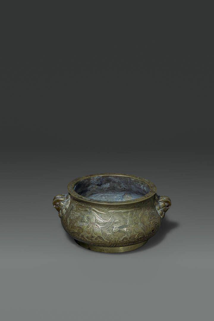 Raro incensiere con manici in bronzo dorato sbalzato con scene di battaglia e di pesca Cina dinastia Qing epoca Qianlong (1736-1795) H cm 11 Diam cm 24 5
