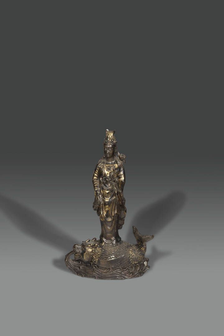 Scultura in bronzo rappresentante Guanyin in posizione eretta su pesce con lumeggiature in oro Giappone XX sec H cm 32x20x9