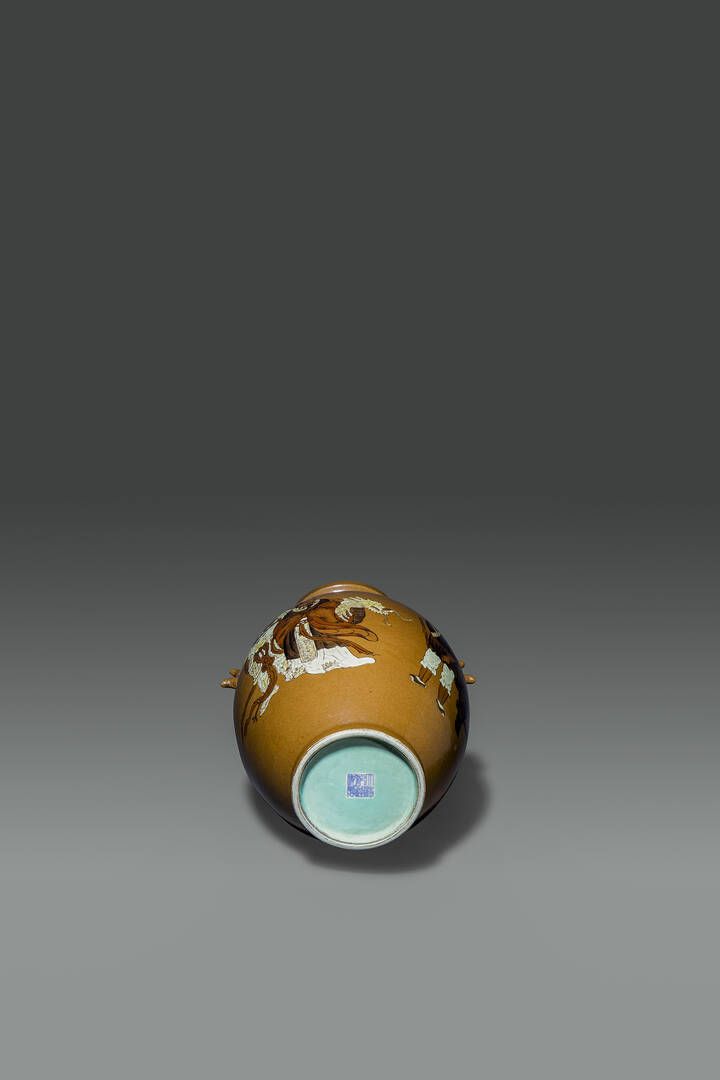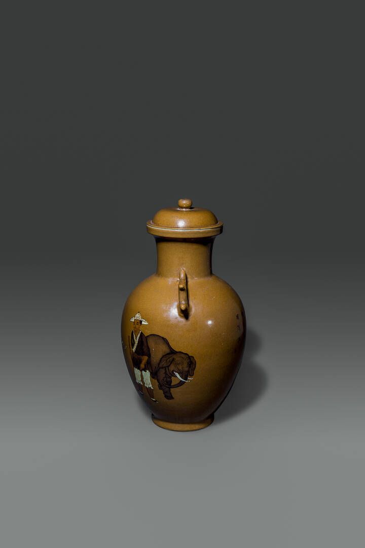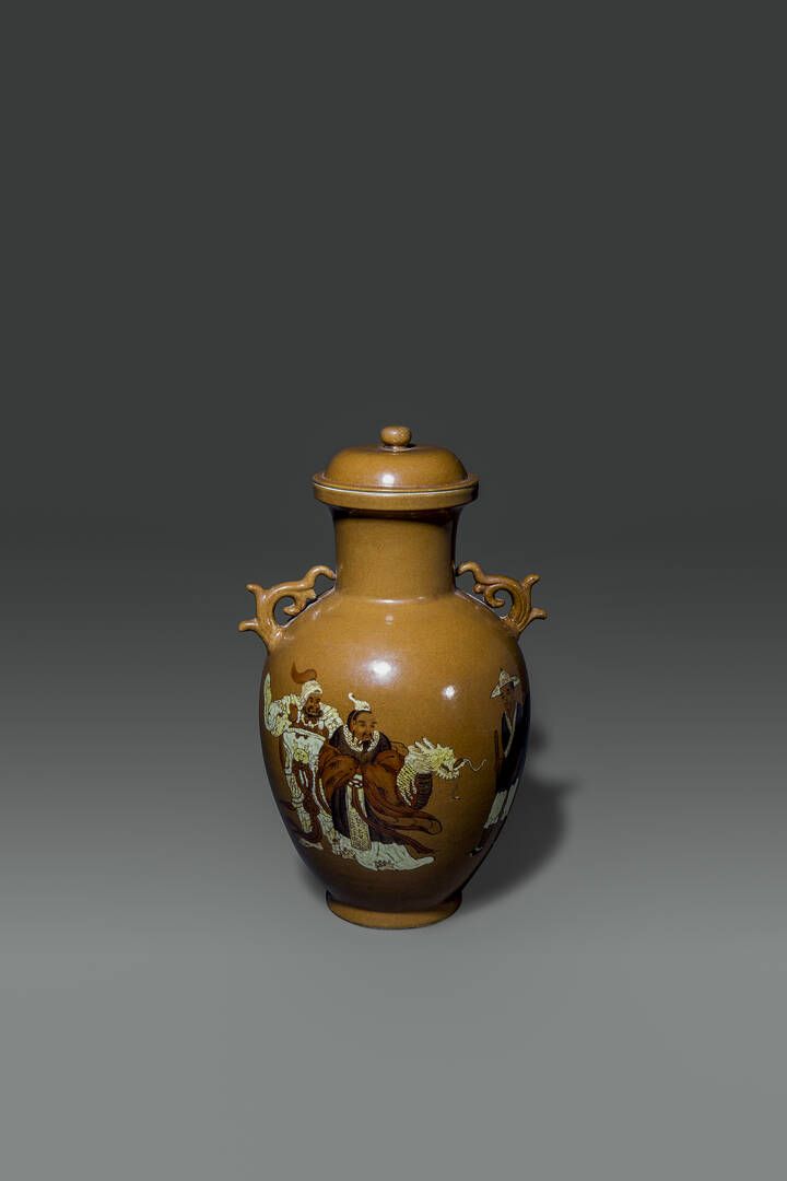 Vaso cappuccino con coperchio e manici decorato con personaggi su drago e iscrizioni al retro Cina dinastia Qing XIX sec Marchio apocrifo Qianlong (1735-1795) H cm 36 Diam cm 22