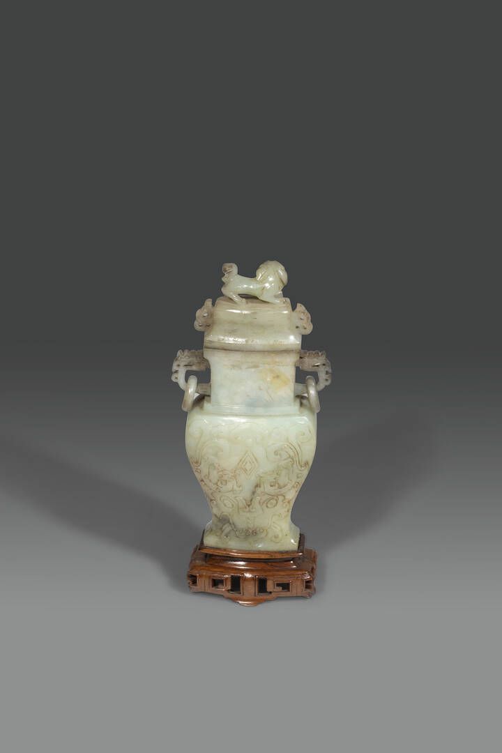Vaso con coperchio sormontato da cane di Pho in giada celadon con russet Cina dinastia Qing XIX sec H cm 19 5x10 5