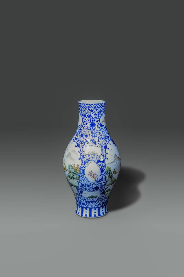 Vaso in porcellana bianco e blu con scene di paesaggi policromi entro riserve Cina [..]