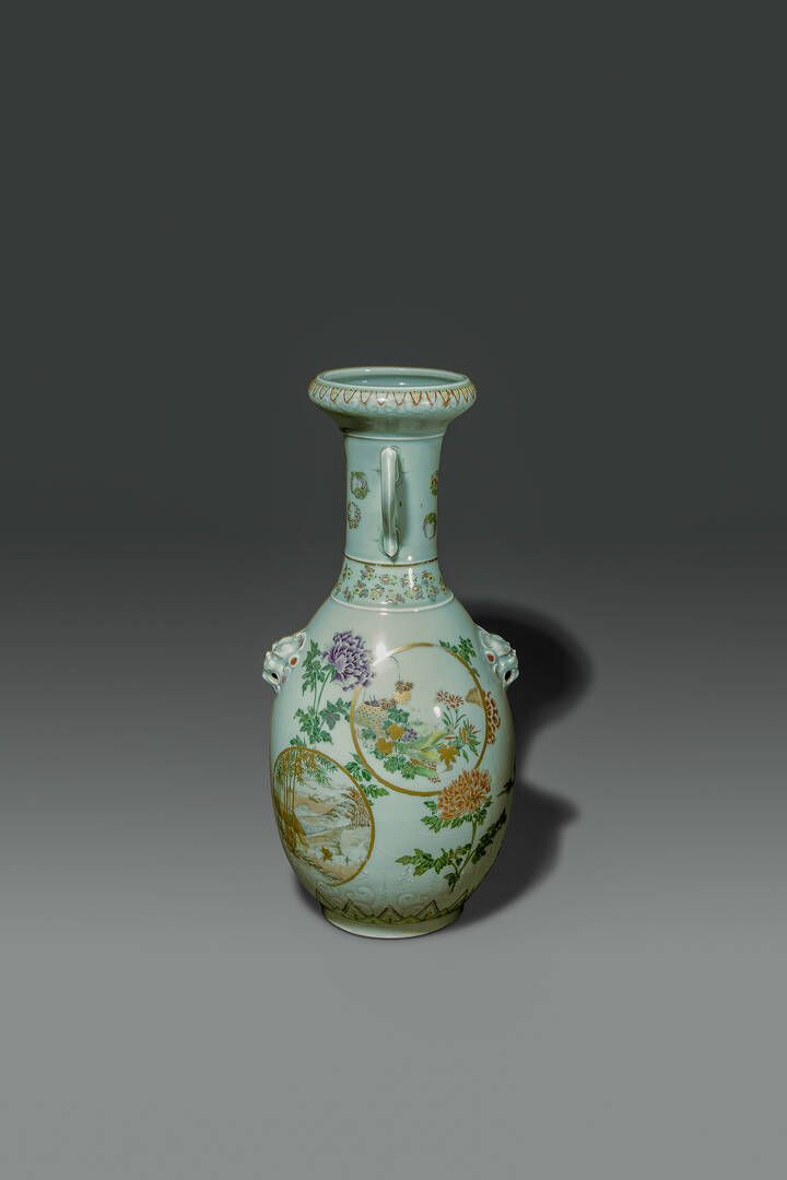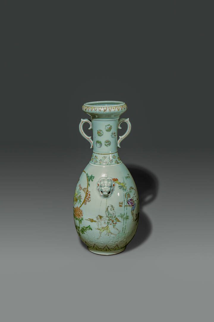 Vaso in porcellana Claire de Lune con lumeggiature oro anse sagomate mascheroni e figure di saggi Cina dinastia Qing epoca Daoguang (1821-1850) H cm 46 5 Diam cm 22