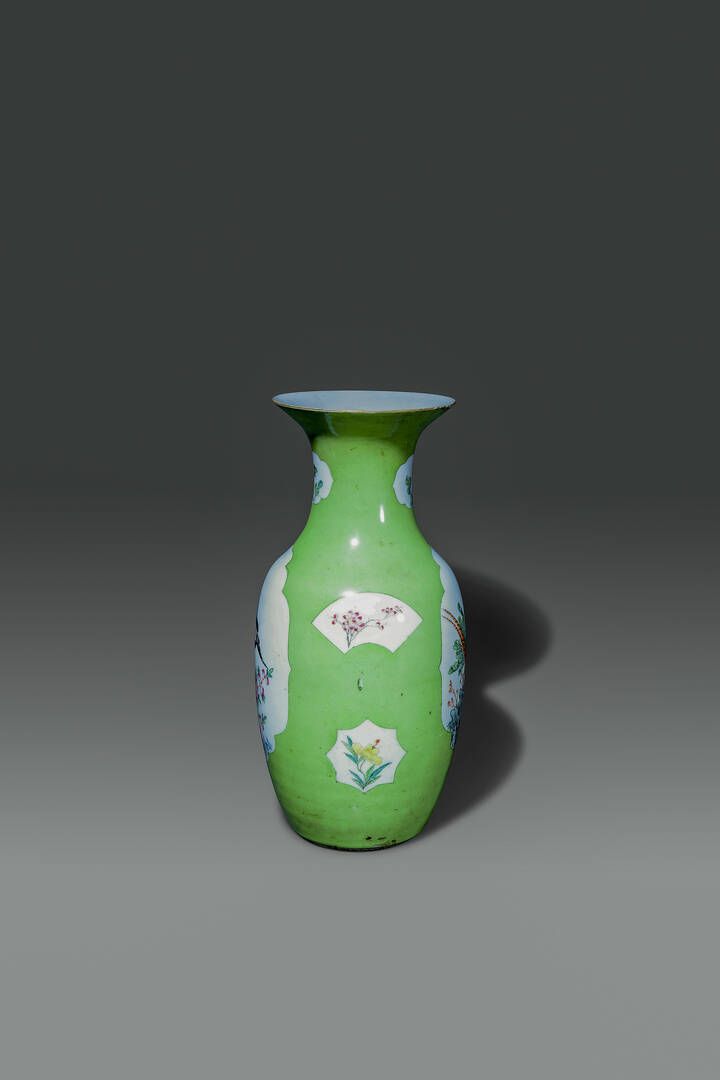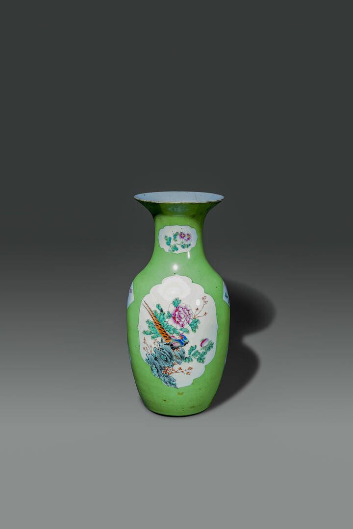 Vaso in porcellana su sfondo verde con dipinti di ucccelli e peonie entro riserve Cina Repubblica XX sec H cm 44 Diam cm 21
