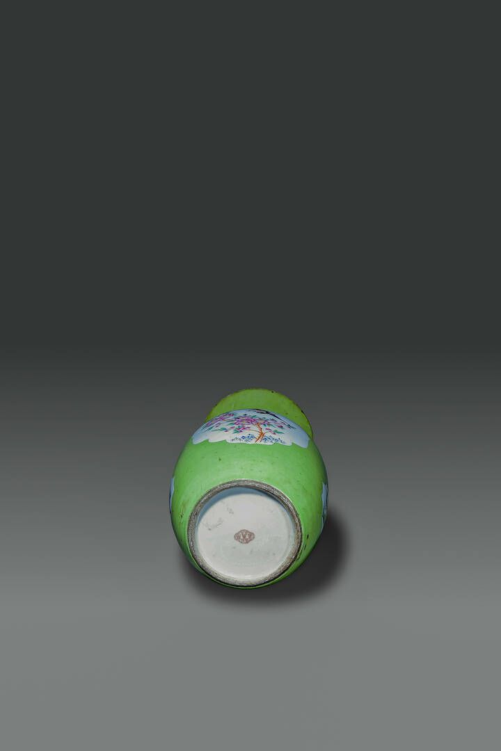 Vaso in porcellana su sfondo verde con dipinti di ucccelli e peonie entro riserve [..]
