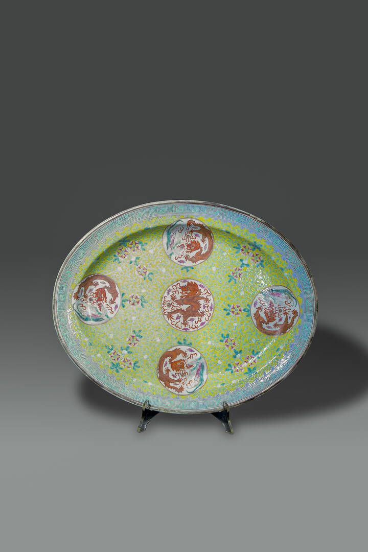Vassoio in porcellana Famiglia Rosa di forma ovale con dipinti floreali e draghi [..]