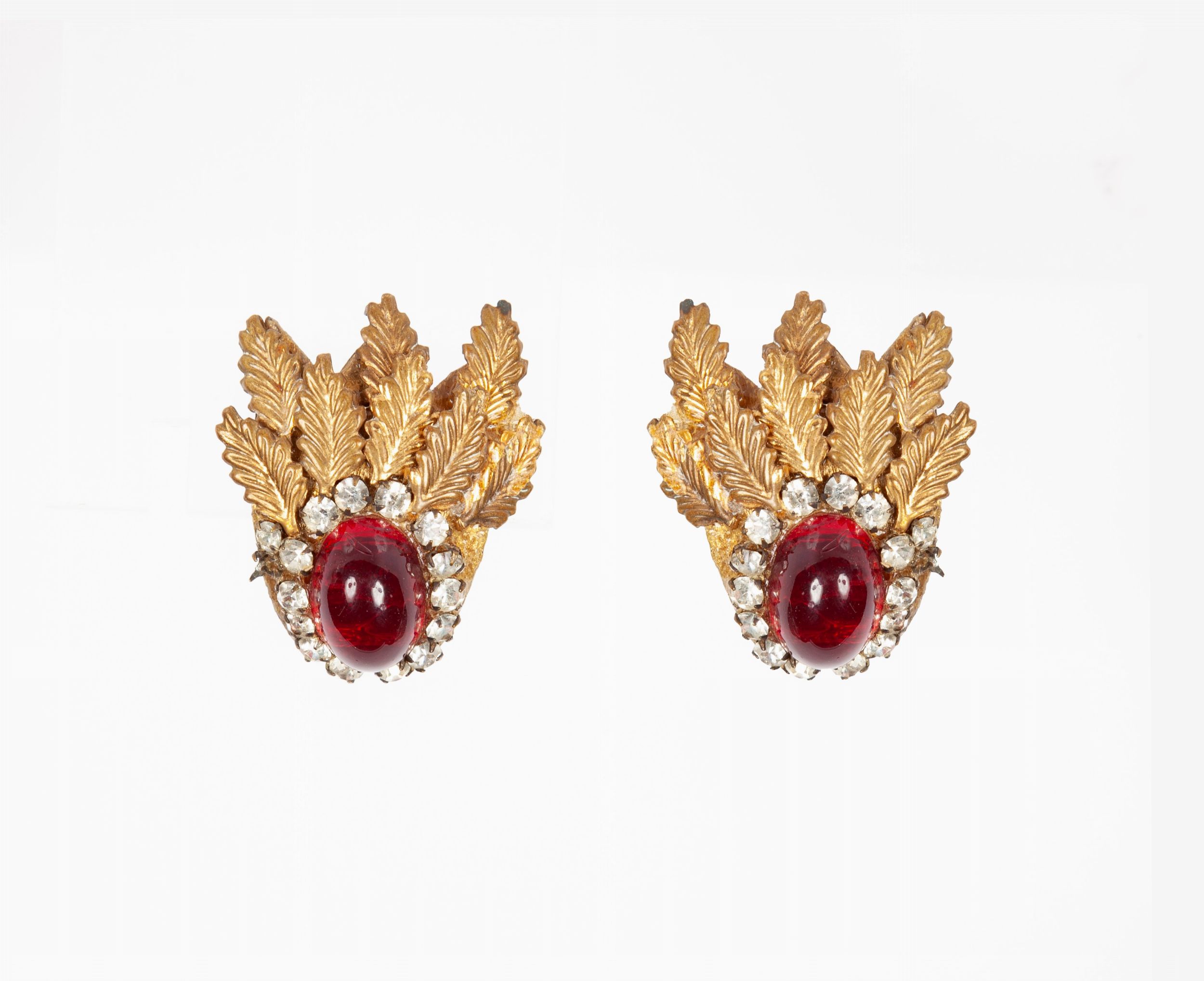 Orecchini a clip, foglie in metallo dorato e pietra rossa