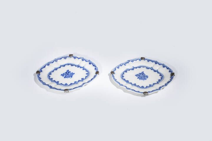 27X23 di forma ovalizzata con bordo sagomato in porcellana bianca con decori blu. XVIII secolo. Presenti sbeccature lungo il bordo.