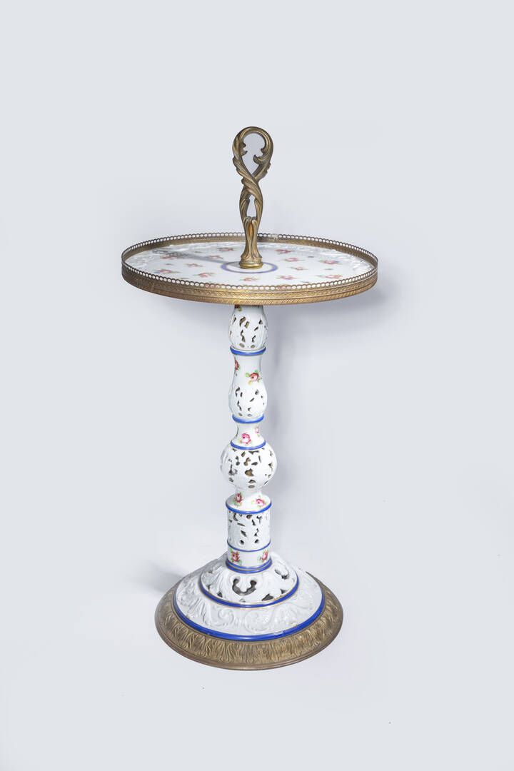 H cm 66 in porcellana dipinta con decori a rose corpo traforato e a volute. Parte superiore con presa e bordo in ottone dorato (difetti alla doratura) base circolare con base in ottone dorato (difetti alla doratura).