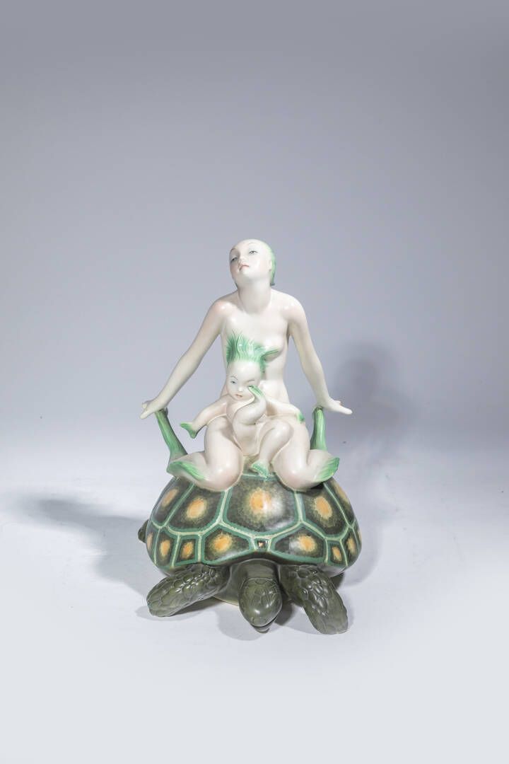 H. cm 32 ceramica policroma Marcata Lenci-Italy sotto la base con il simbolo del decoratore Domenico Cogno Presenta quattro dita della sirena rotte e mancanti Scheggiatura di una delle punte dei capelli delle sirena piccola scheggiatura nella parte centrale della coda del piccolo piccola scheggiatura gamba sinistra della tartaruga Bibl.: - Alfonso Panzetta Le ceramiche Lenci - 1928/1964 - Catalogo generale dell'archivio storico della manifattura Allemandi 1992 tavola n.512 pp.190