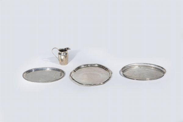Peso gr 1499 5 composto da: -1 vassoio di forma ovale con bordo lavorato a nastro. Punzone Lombardo -Veneto. Argentiere A.C. Peso gr 453 4 -1 vassoio ovale con bordo traforato. Punzone Lombardo-Veneto città di Venezia. Peso gr 310 7 -1 vassoio di forma rotonda con bordo mosso. Punzoni non identificati. Peso gr 524 4 -1 piccola brocca con punzone Lombardo-Veneto città di Venezia. Peso gr 211 0. Ammaccatura in corrispondenza della base.