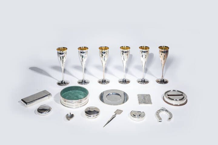Peso gr 1791 4 composto da: -6 calici in argento 925/1000 interno dorato. Peso gr 1157 0 -1 ferro di cavallo in argento 925/1000. Peso gr 49 3 -1 porta post-it con base in legno in argento 925/1000. Peso netto gr 66.7 -1 porta block notes con base non in argento. -1 svuotatasche con struttura in argento e parte interna in velluto verde e base in plastica. -1 portasigari in argento 925/1000. Peso gr 170 5 -1 piccola scatola di forma rotonda con coperchio in argento 925/1000. Peso gr 62 5 -1 portasigarette con punzoni inglesi. Peso gr 45 -1 piccola alzata a forma di foglia. Peso gr 27 4 -1 tagliacarte in argento 925/1000. Peso gr 30 7 -1 piattino. Diam. cm 16. Peso gr 182 3