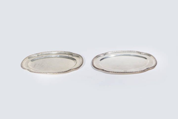 Peso gr 2200 5 e 2200 1 Lotto di due vassoi di forma ovale bordo sagomato con decori a festoni. Uno reca la firma Cartier-Made in France l'altro reca la firma Robert Linzeler Argenson.