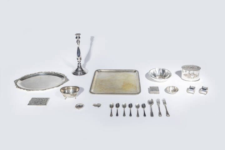 Peso gr 3278 4 composto da: -1 scatola con coperchio di forma ovale decorata con motivi floreali. Peso gr 368 9 -1 portacipria e rossetto con specchio. -2 forchettine e 7 cucchiai spaiati. Peso gr 140 1 -1 ciondolo di Pomellato a forma di Dodo. Gancio rotto. Peso gr 48 -1 ciotolina. Peso gr 26 1 -1 ciotolina ovale poggiante su quattro piedini. Peso gr 128 6 -1 ciotolina a forma di conchiglia. Peso gr 13 7 -1 ciotola. Peso gr 112 0 -1 portasigarette. Peso gr 104 3 -1 candeliere. Peso gr 446 2 -2 portatovaglioli. Peso gr 82 5 -1 vassoio ovale con bordo a volute. Peso gr 631 5 -1 vassoio quadrato con bordo decorato a palmette. Peso gr 1176 5