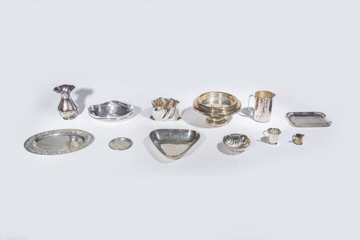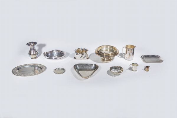 Peso gr 4053 3 composto da: -1 piattino rotondo con bordo a palmette (difetto). Peso gr 26 4 -1 vaso bombato. Peso gr 411 7 -1 versatoio. Peso gr 462 8 -1 ciotola di forma ovale. Peso gr 376 2 -1 portaoggetti a forma di sacchetto in argento 925/1000. Peso gr 321 9 -1 piccolo versatoio firmato Greggio. Peso gr 41 8 -1 tazzina con punzoni inglesi in argento 925/1000. Peso gr 86 9 -1 svuotatasche a forma di conchiglia. Peso gr 132 7 -1 vassoio piccolo in argento 925/1000. Peso gr 302 7 -1 ciotola triangolare bombata. Peso gr 463 9 -1 alzata di forma geometrica e bombata. Peso gr 975 7 -1 vassoio ovale con bordo sbalzato a motivi vegetali. Peso gr 450 6