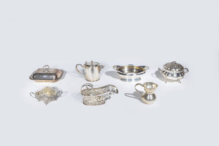 Peso gr 5012 7 composto da : -1 portabottiglie con lati traforati. Peso gr 618 1 -1 alzata con struttura traforata e decorata da festoni e putti con fiori. Parte interna in vetro. Peso netto gr 211 7 -1 centrotavola con coperchio di forma rotonda con corpo bombato e presa a forma di fragola. Poggiante su quattro piedini. Peso gr 1271 0 -1 alzata di forma ovale con base ovalizzata. Peso gr 695 4 -1 teiera di forma ovalizzata con manico a voluta e versatoio a forma di testa di uccello. Peso gr 871 0 -1 versatoio bombato. Peso gr 348 2 -1 portavivande con coperchio di forma rettangolare. Peso gr 997 3