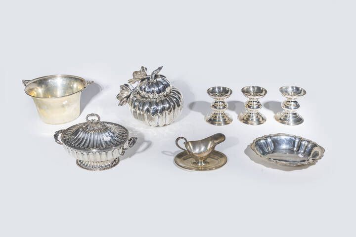 Peso gr 5736 composto da: -1 grande centrotavola a forma di zucca con parte interna dorata. Peso gr 1656 9 -1 grande cestino portaghiaccio e bottiglia. Peso gr 1435 8 -1 legumiera di forma ovale interamente rastremata. Base ovale e manici e presa a volute. Peso gr 1811 1 -1 salsiera con piatto Peso gr 476 -1 ciotola di forma ovale con bordo sagomato. Peso gr 356 2 -3 portacandele con base rotonda e interno non in argento. Peso lordo gr 564 3 518 8 685