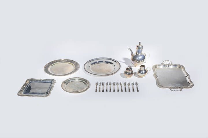 Peso gr 5752 3 composto da: -12 forchettine da dolce. Peso gr 357 6 -1 piatto di forma rotonda con decoro del bordo a palmette. Diametro cm 38. Peso gr 1002 8 -1 vassoio di forma quadrata. Peso gr 451 6 -1 piatto con bordo inciso e sbalzato a decori floreali. Peso gr 869 1 -1 piattino. Diametro cm 25. Peso gr 356 7 -1 vassoio di forma rettangolare con manici. Peso gr 1753 8 -1 servizio composto da teiera lattiera e zuccheriera (manici in ceramica- uno sbeccato). Peso gr 960 7
