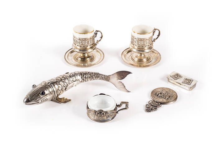 Peso gr 611 0 Composto da: - un piccolo specchio di forma rotonda con sbalzata una scena di vita. Manico lavorato a volute - un pesce portaspezie. Reca punzone Torre e drago - due tazzine con manico bordo traforato elementi interni in ceramica e due piattini - una tazzina con parte interna in ceramica bianca. Reca punzone VM800 - una scatola con contenitori per colla e francobolli di forma rettangolare decorati con due francobolli sbalzati ed incisi recanti la scritta Deutsche/Reichs/Post