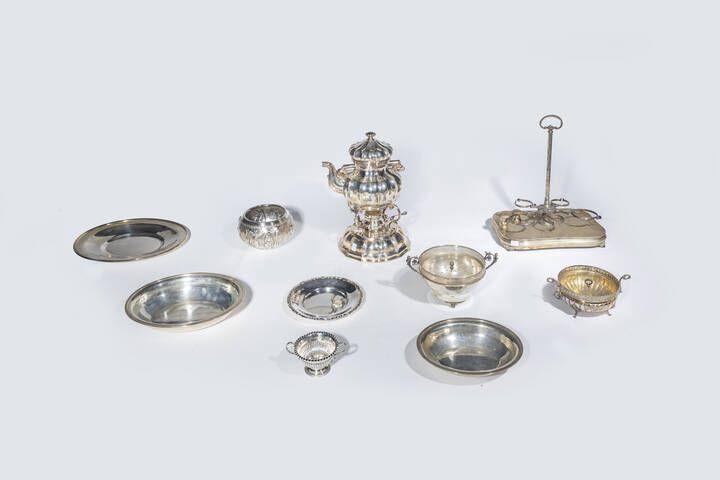 Peso gr 6279 composto da: -1 piattino con bordo sagomato: Peso gr 148 3 -1 alzata di forma ovale. Peso gr 539 3 -2 ciotole ovali con bordo a decoro a palmette. Peso gr 574 8 -1 zuccheriera con manici firmata Tiffany Peso gr 104 -1 samovar con manico in legno. Peso gr 2592 1. -2 portafiori. Peso gr 238 0 e 299 7 -1 base per acetiera ed oliera (bottiglie mancanti) e presenti pepiera e saliera. Peso gr 1340 -1 vaso con sbalzati motivi egiziani. Peso gr 442 8