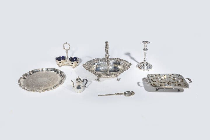Peso gr 6498 4 composto da: -1 grande cestino punzoni inglesi bordo traforato a motivi vegetali. Peso gr 3012 8 -1 cucchiaio recante punzoni inglesi interamente inciso. Peso gr 95 4 -1 piccola caffettiera marcata Mappin & Webb. con manico in legno ebanizzato. Peso gr 155 4 -1 candeliere con base sagomata. Peso gr 593 8 - 1 porta salse con punzoni non identificati. Presenti ciotole interne in vetro blu (una rotta). Peso gr 751 6 -1 scaldavivande con base in argento e parte traforata e lumino non in argento. Peso netto gr 769 4 -1 vassoio rotondo con bordo frastagliato e decorato a baccello interno inciso. Poggiante su quattro piedini. Peso gr 1120 0