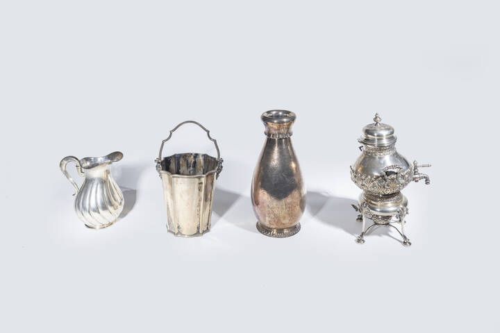 Peso gr 6560 7 composto da -1 samovar con corpo bombato coperchio con presa geometrica (cerniera di raccordo rotta). Peso gr 2421 1 -1 brocca con corpo bombato e lavorato a torchon. Peso gr 870 4 -1 secchiello per bottiglia firmato Miracoli. Peso gr 1687 2 -1 grande vaso con corpo bombato. Peso gr 1582