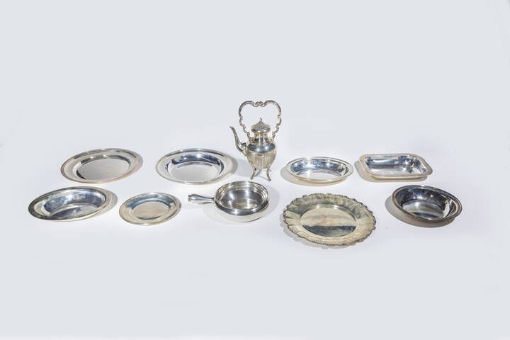 Peso gr 6888 5 Lotto in argento composto da: - 1 pentola con manico. Peso gr 636 2 - 1 teiera corpo bombato manico centrale. Peso gr 773 4 - 3 ciotole di varie forme e misure. Peso gr 1955 4 - 1 piatto di forma rotonda bordo decorato a palmette. Diam. cm 34 Peso gr 850 4 -1 piatto fondo formato Miracoli. Diam. cm 35 Peso gr 968 3 -1 piatto fondo. Diam. cm 25. Peso gr 386 3 - 1 piatto firmato G. Bavelli- Milano. Peso gr 511 4 - 1 piatto con bordo sagomato firmato Cassina. Peso gr 807 1