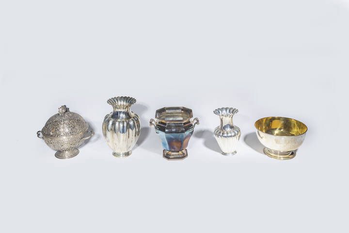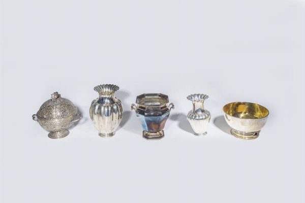 Peso gr 6979 8 composto da - 1 vaso corpo bombato lavorato a torchon bocca sagomata. Peso gr 544 5 - 1 grande vaso bombato lavorato a torchon bocca sagomata. Peso gr 1256 6 - 1 grande ciotola con interno dorato firmata Miracoli. Peso gr 1128 7 - 1 vaso con manici struttura geometrica. Peso gr 1423 3 - 1 grande centrotavola con coperchio firmato Massena interamente traforato presa a forma di fiori. Peso gr 2626 7