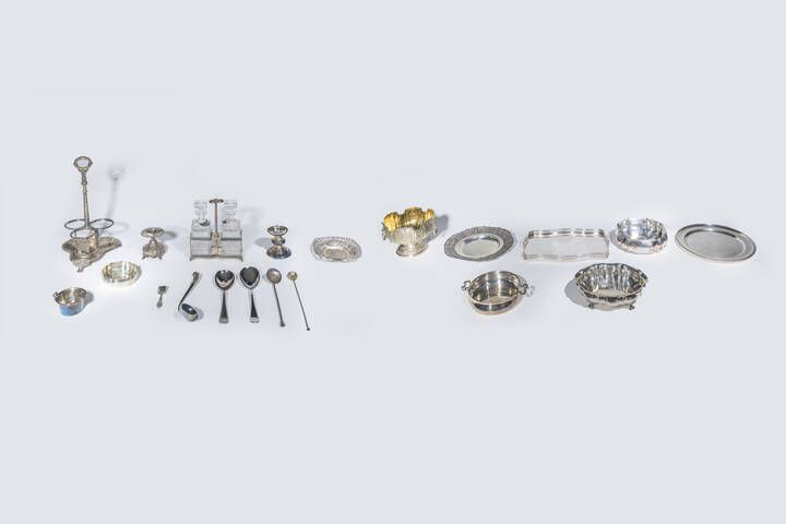 Peso gr 9228 9 Lotto di oggetti in argento composto da: - 1 pentolina con manici Peso 365 - 1 coppa con interno dorato. Peso gr 1148 8 -1 portabottiglie con bottiglie in vetro. Peso netto gr 527 6 -1 struttura porta bottiglie (vetri mancanti). Peso gr 1176 6 -1 bugia. Peso gr 215 9 -1 bugia con base recante inserto ligneo. Peso lordo gr 259 5 -1 ciotolina con manico. Peso gr 91 8 -1 alzata di forma ovale con bordo sagomato. Poggiante su quattro piedini. Peso gr 560 4 -1 ciotolina sagomata. Peso gr 130 7 -1 grande ciotola sagomata. Peso gr 671 2 -1 ciotola con bordo traforato. Peso gr 197 4 -1 vassoio di forma rettangolare con bordo traforato. Peso gr 1827 0 -1 piatto con bordo traforato. Diam. 35 cm. Peso gr 788 1 -1 piatto con bordo torchon. Diam. cm 38. Peso gr 907 1 -2 cucchiai da portata. Peso gr 376 -3 posate da portata. Peso gr 245 3