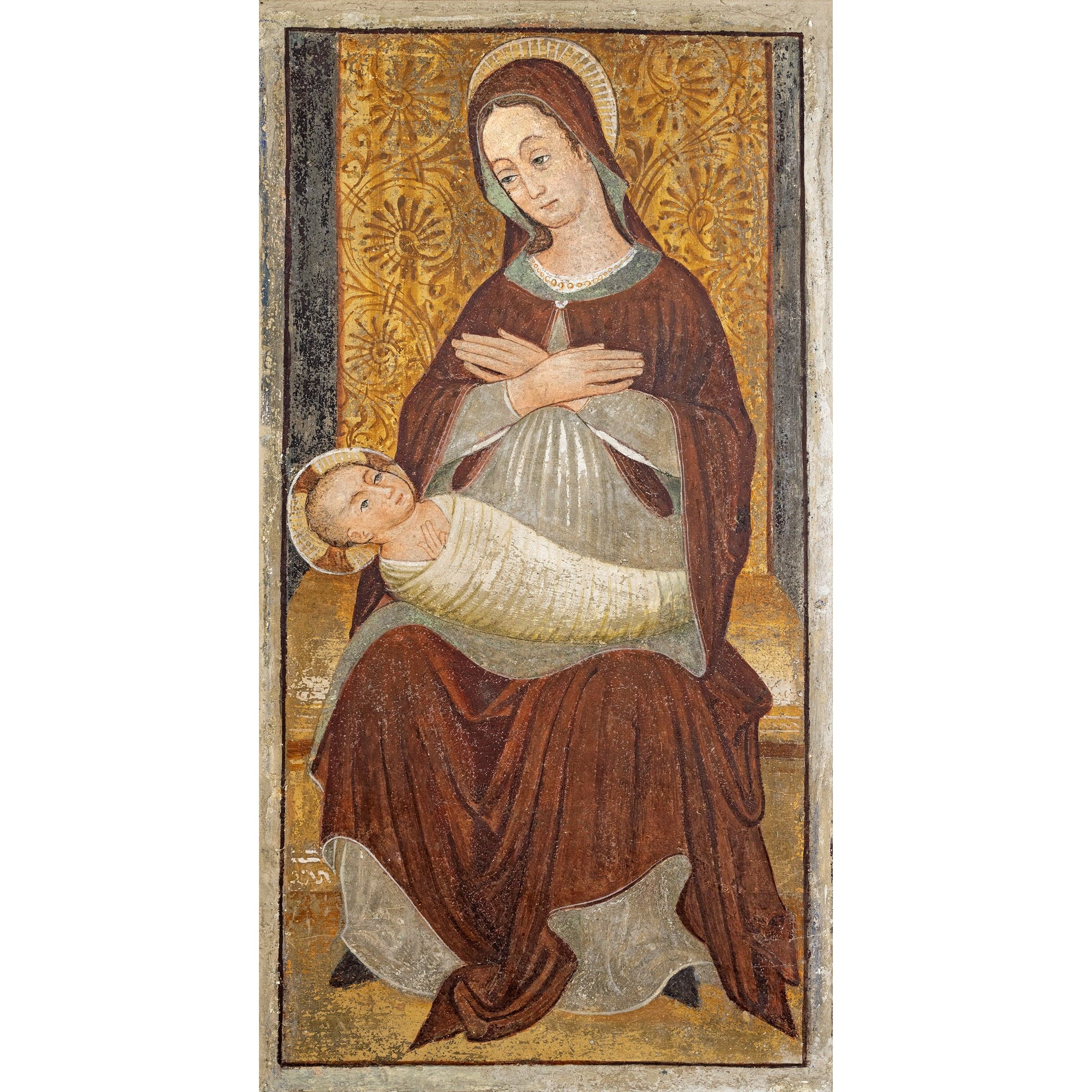 Fossano 1453 - Milano 1523 La Vergine con il Bambino, strappo di affresco riportato su legno, entro cornice