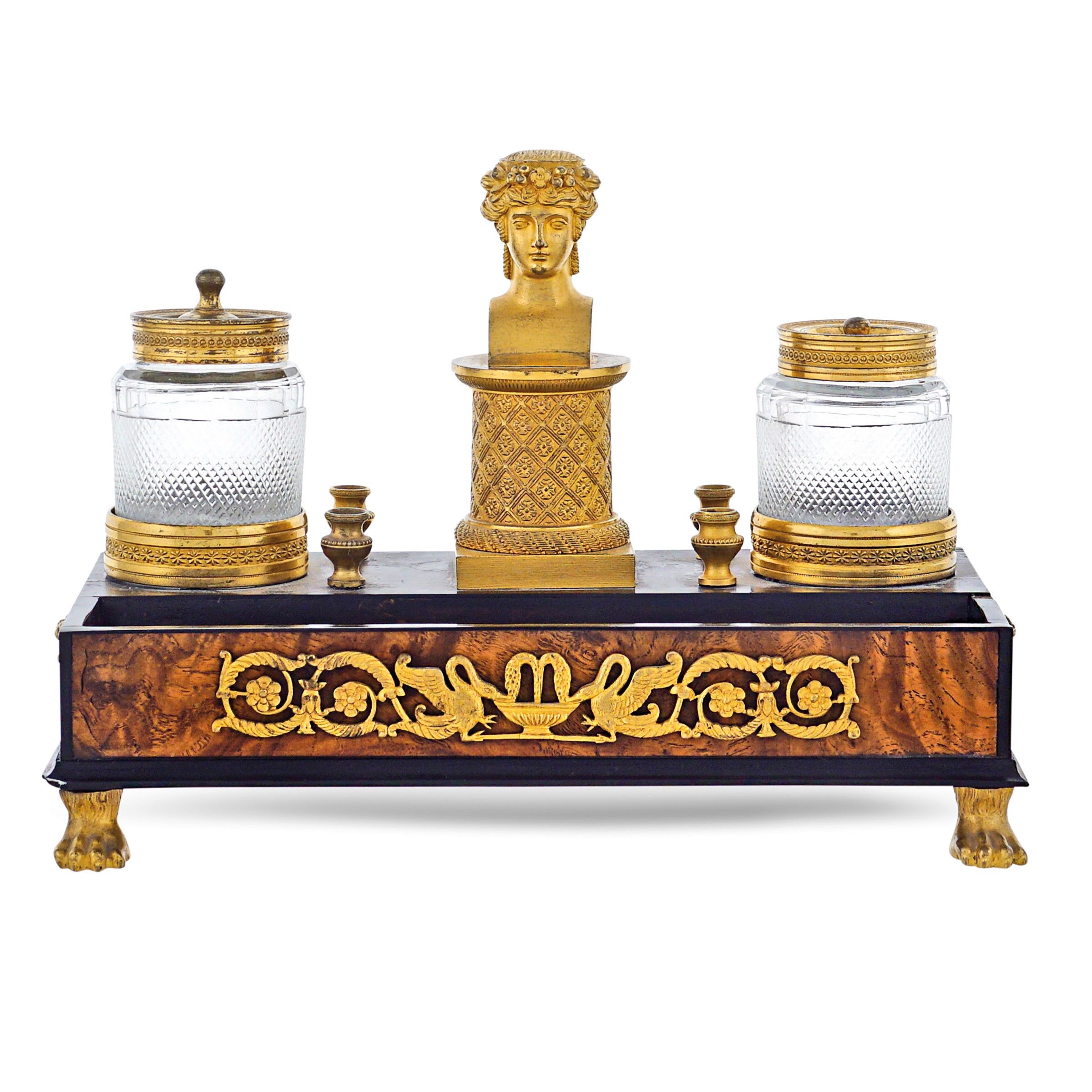 16,5x22,5x13 cm. Francia, XIX Sec. forma rettangolare poggiante su quattro piedini ferini, base decorata con fregi in bronzo dorato, al centro busto femminile in bronzo poggiante su base a plinto, ai lati due ampolle in vetro molato e bronzo, usure e mancanze
