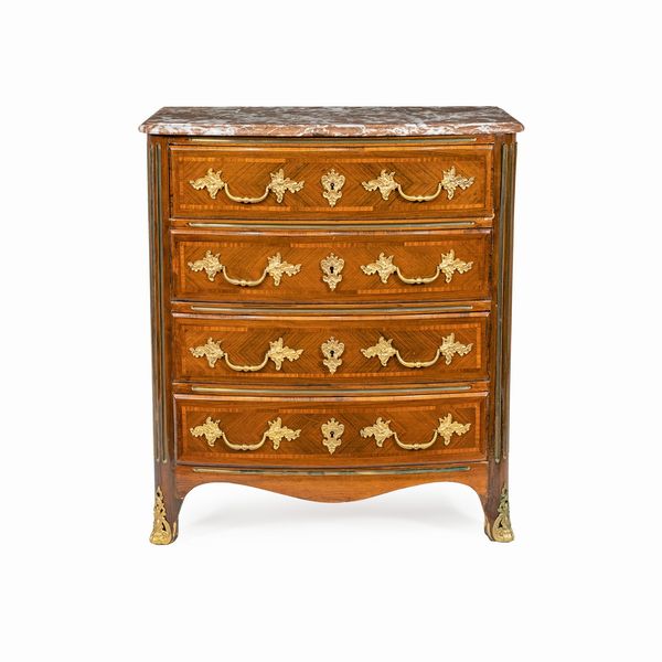Francia, XIX Sec. fronte con quattro cassetti, maniglie e fregi in bronzo dorato e cesellato, piano in marmo rosso di Francia