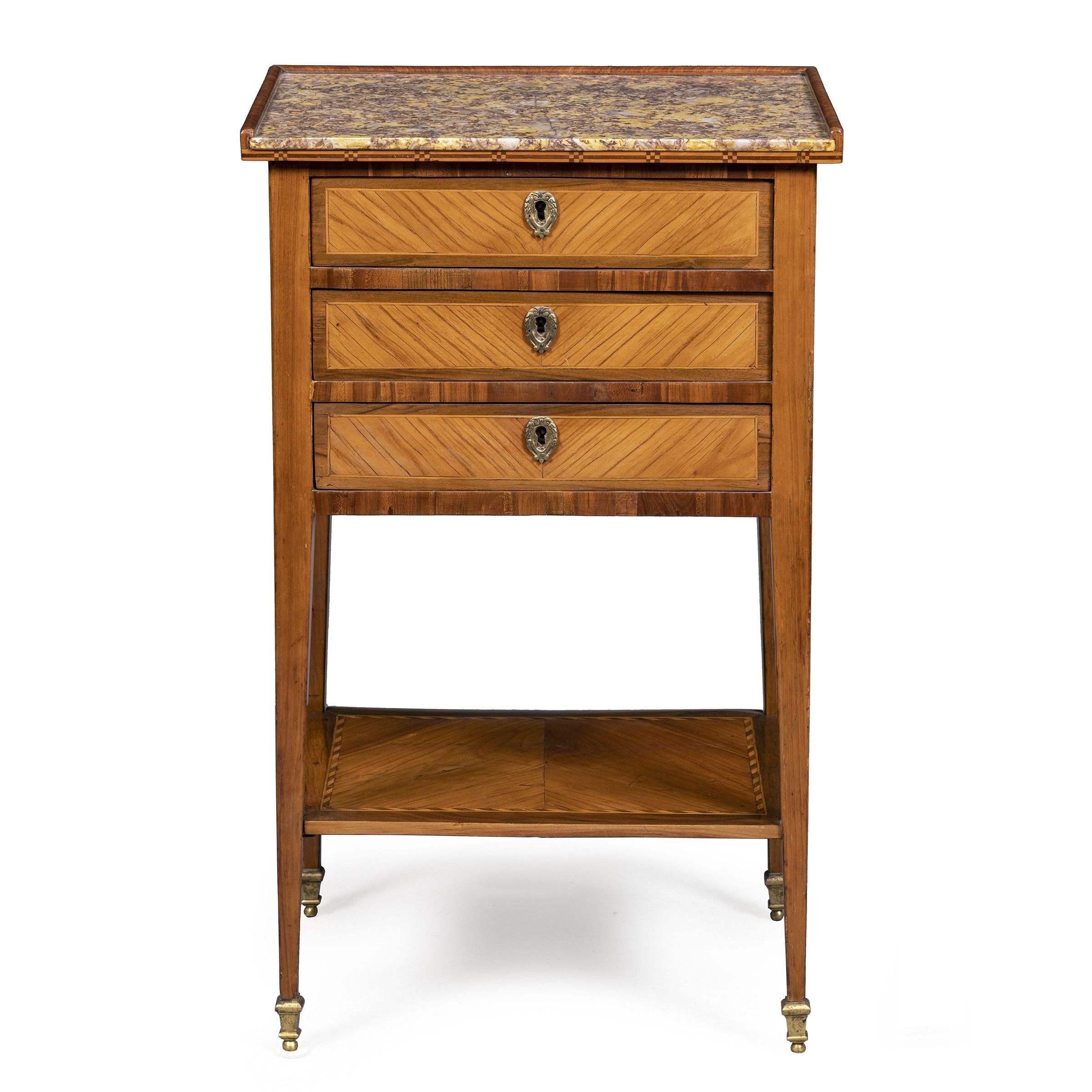 Francia, XIX Sec. piano in marmo broccatello di Spagna, fronte a tre cassetti, gambe troncopiramidali riunite da un ripiano, bocchette e piedini in bronzo dorato, lievi usure