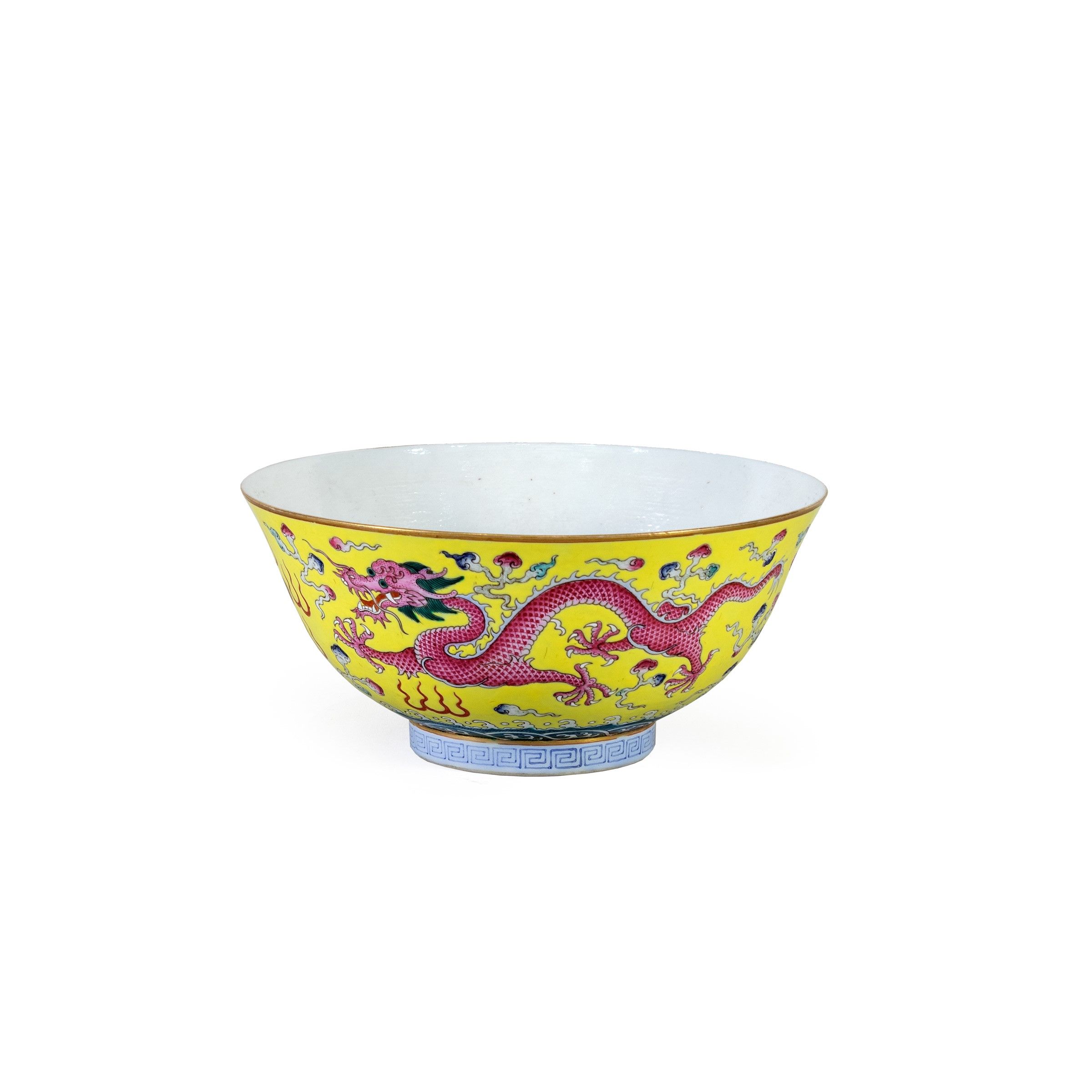 Cina, XX Sec. con decoro di drago, fenice, nuvole e pipistrelli su fondo giallo, base con bordo a motivo di greca