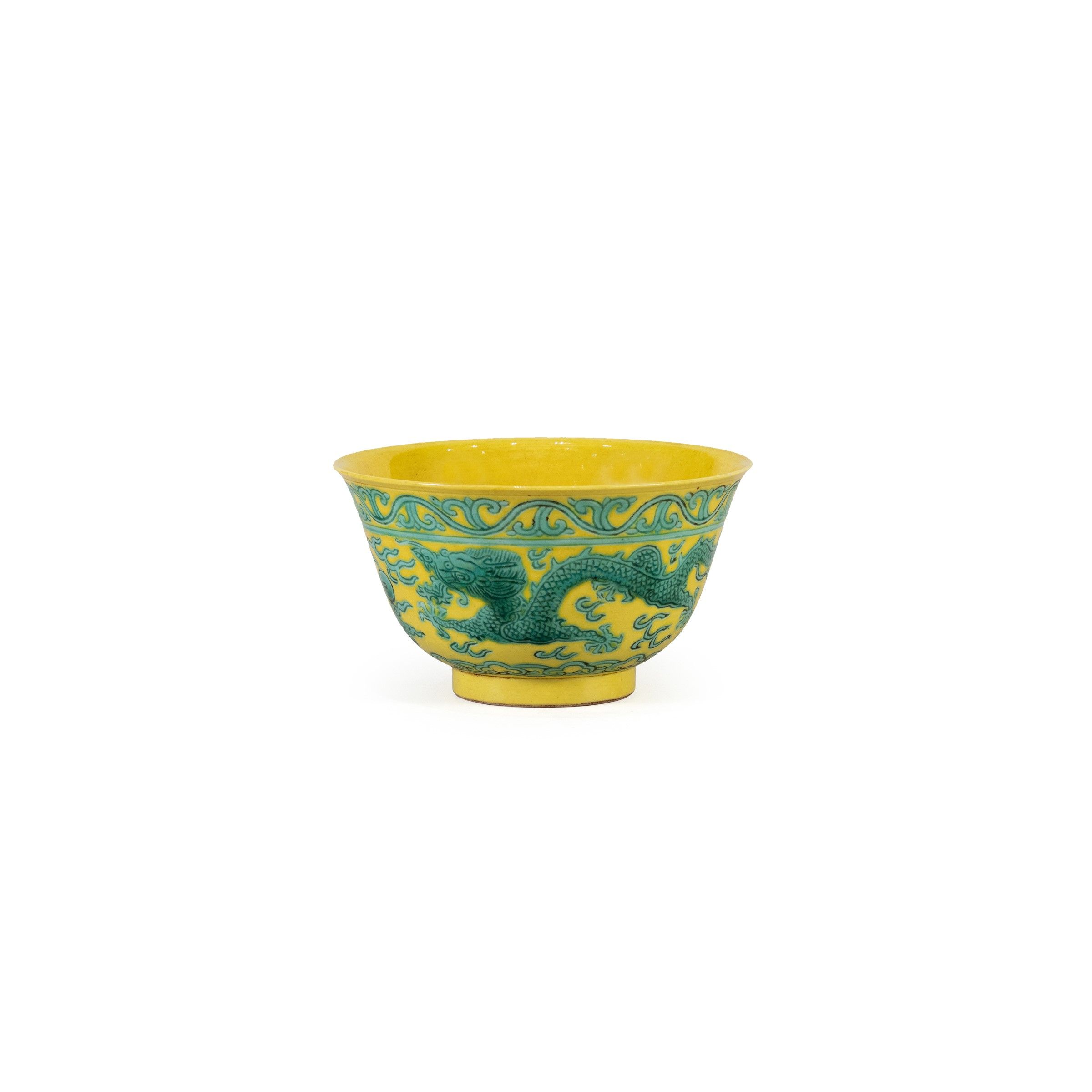Cina decorata con dragoni verdi su fondo giallo, marchio apocrifo Qianlong