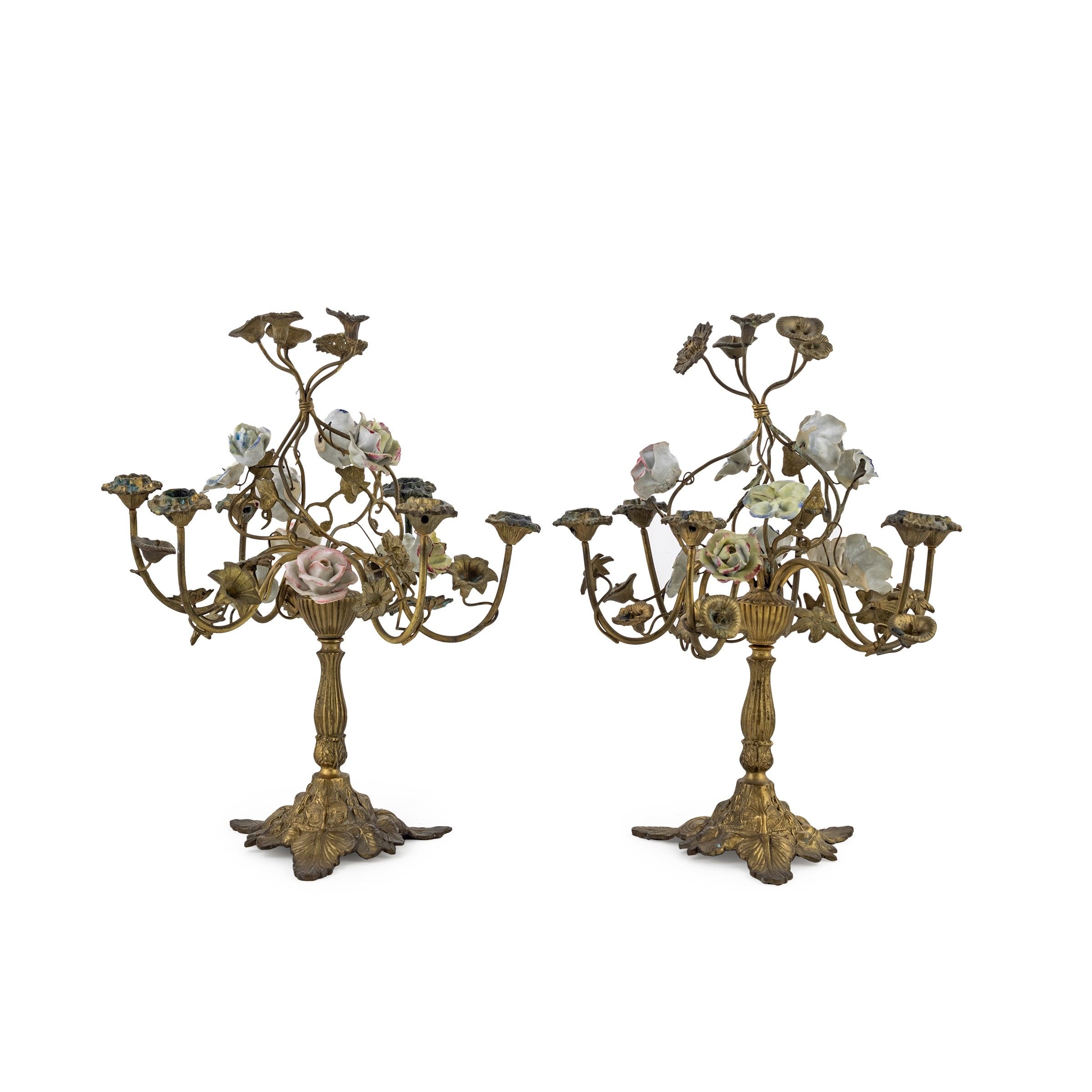 Coppia di candelabri in bronzo dorato e porcellana policroma