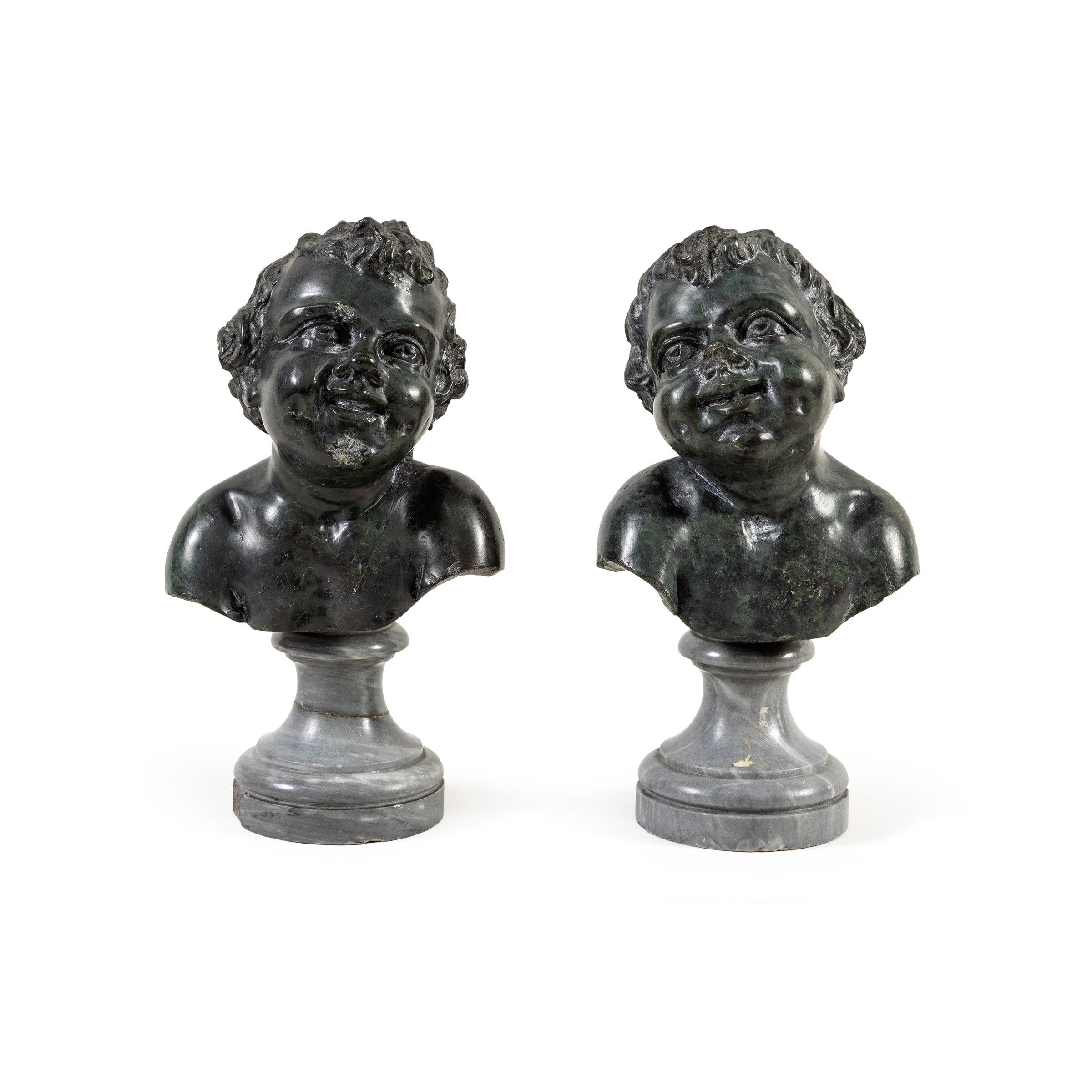 XIX Sec. raffiguranti volti di fanciulli, realizzati in marmo verde di Prato e poggianti su basi in marmo bardiglio