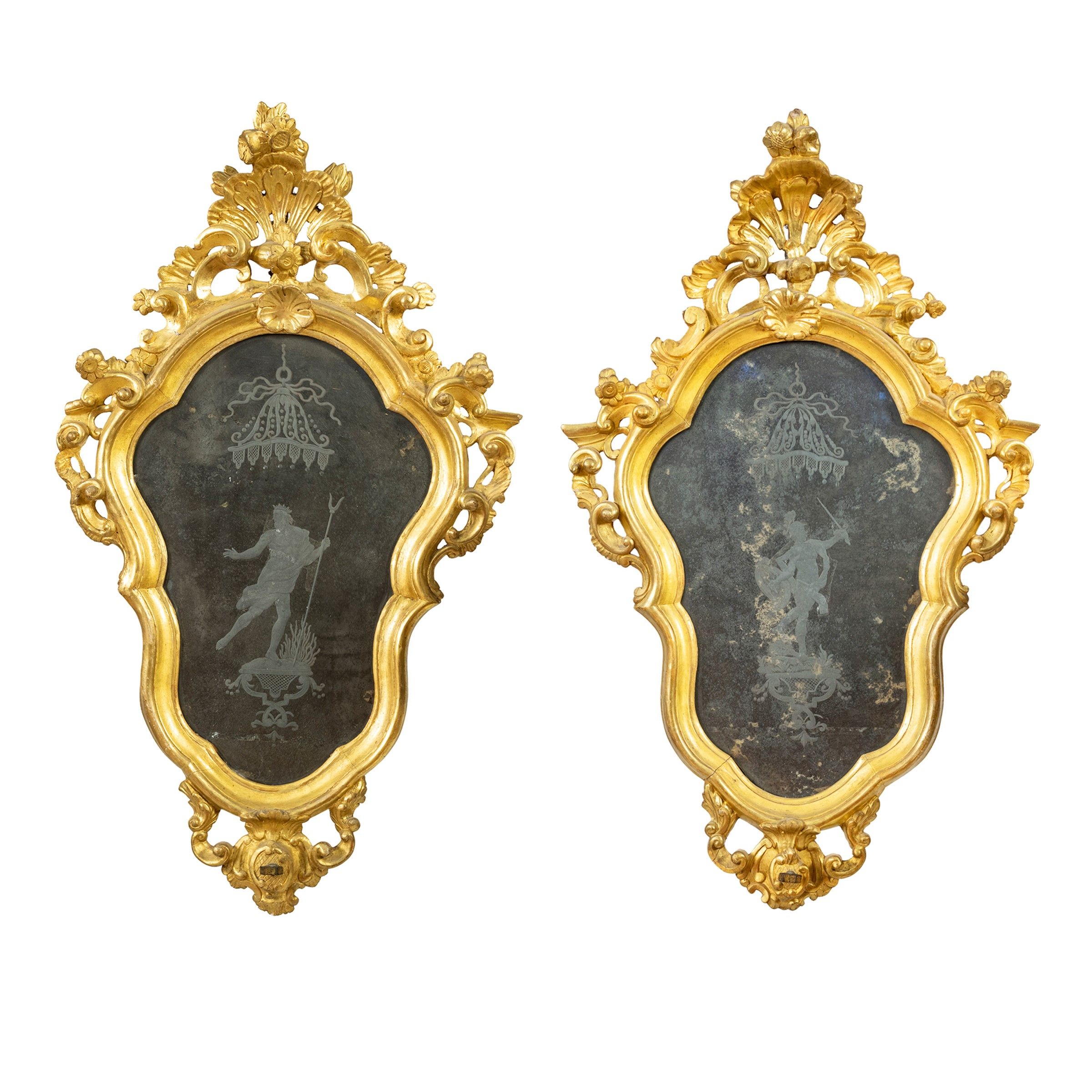 Veneto, XVIII Sec. cornici intagliate con motivi floreali e di volute, specchi a mercurio incisi all'acido a raffigurare personaggi mitologici, lievi usure